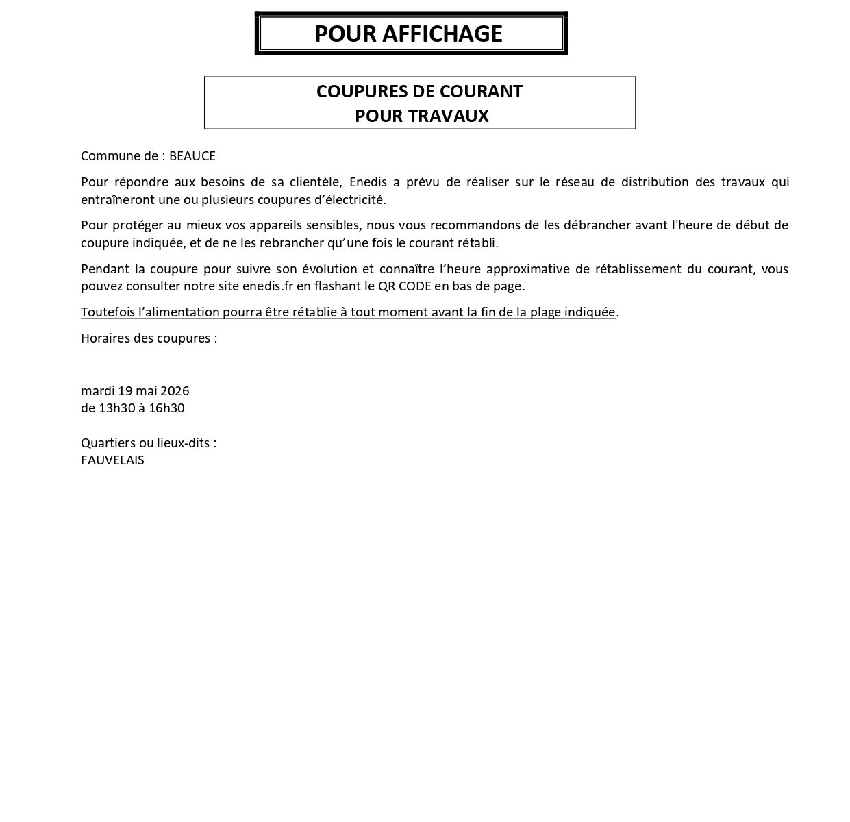 Le balayage des rues de l’agglomération de Beaucé aura lieu le lundi 20 avril 2026 à partir de 08h30. Afin d’en assurer l’efficacité, nous remercions les riverains d’éviter de stationner leurs véhicules aux abords de la voirie.
