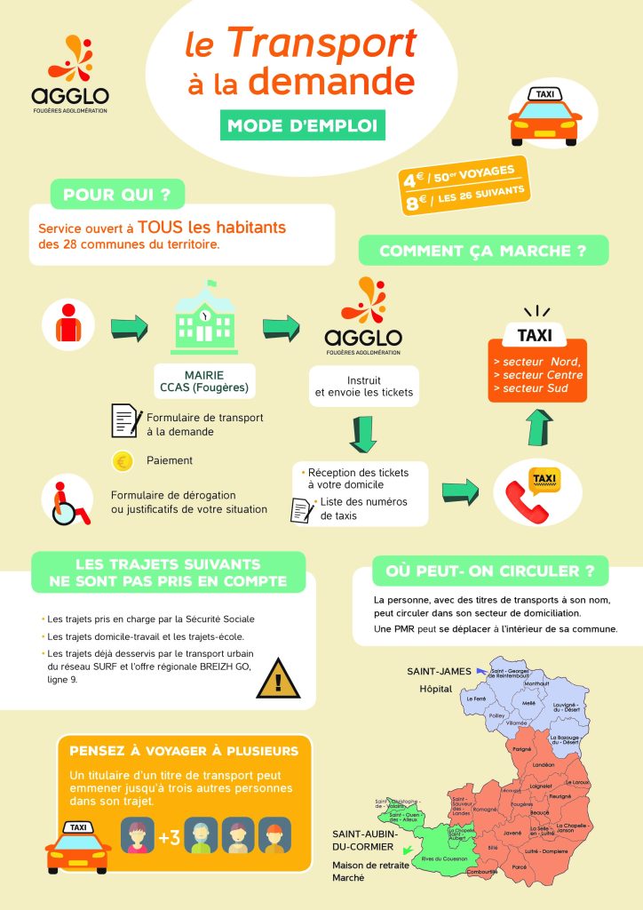 C’est un service public créé et porté par Fougères Agglomération depuis 2019. L’Agglomération conventionne avec des entreprises de taxis. Le bénéficiaire paye une somme quasi-gratuite tandis que Fougères Agglomération règle le reste à charge. Ce service est ouvert pour les habitants des 28 communes du territoire.