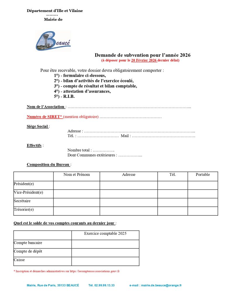 Pour effectuer une demande de subvention communale, il est obligatoire de compléter le formulaire ci-dessous et fournir les pièces demandées. Les dossiers ne pourront être étudiés en cas d’oubli de pièces.