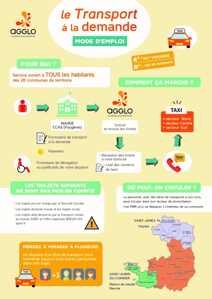 C’est un service public créé et porté par Fougères Agglomération depuis 2019. L’Agglomération conventionne avec des entreprises de taxis. Le bénéficiaire paie un ticket 4€ par trajet tandis que Fougères Agglomération règle le reste à charge. Ce service est ouvert pour les habitants des 28 communes du territoire.